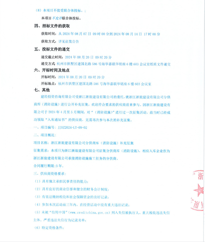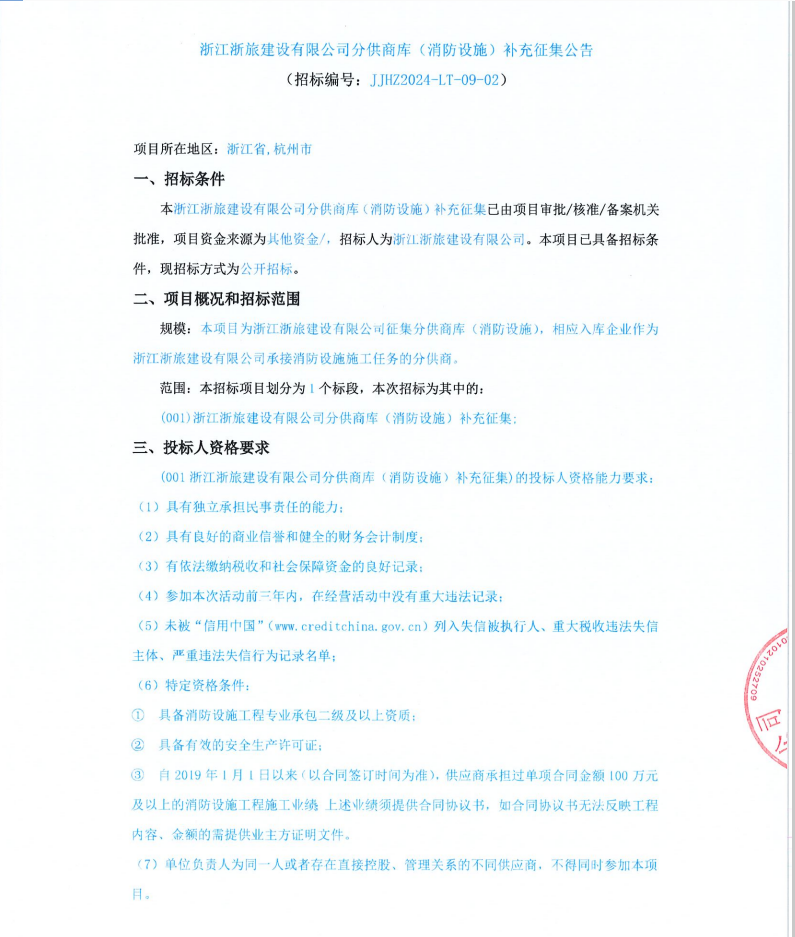 浙江浙旅建設(shè)有限公司分供商庫(kù)(消防設(shè)施)補(bǔ)充征集公告