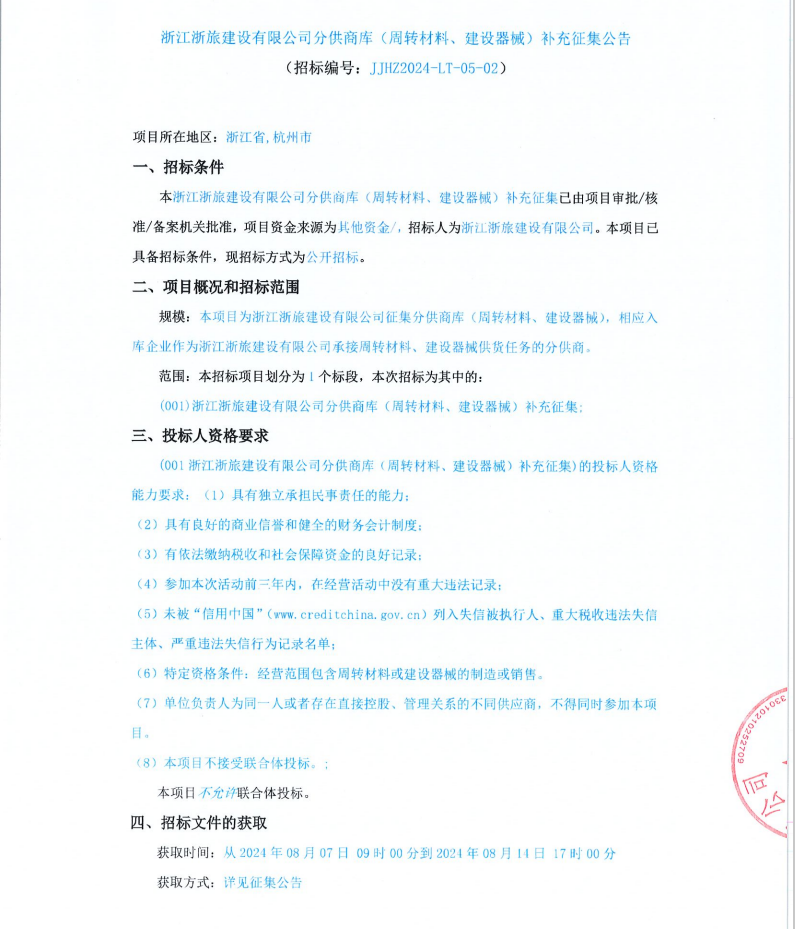 浙江浙旅建設(shè)有限公司分供商庫(周轉(zhuǎn)材料、建設(shè)器械)補充征集公告