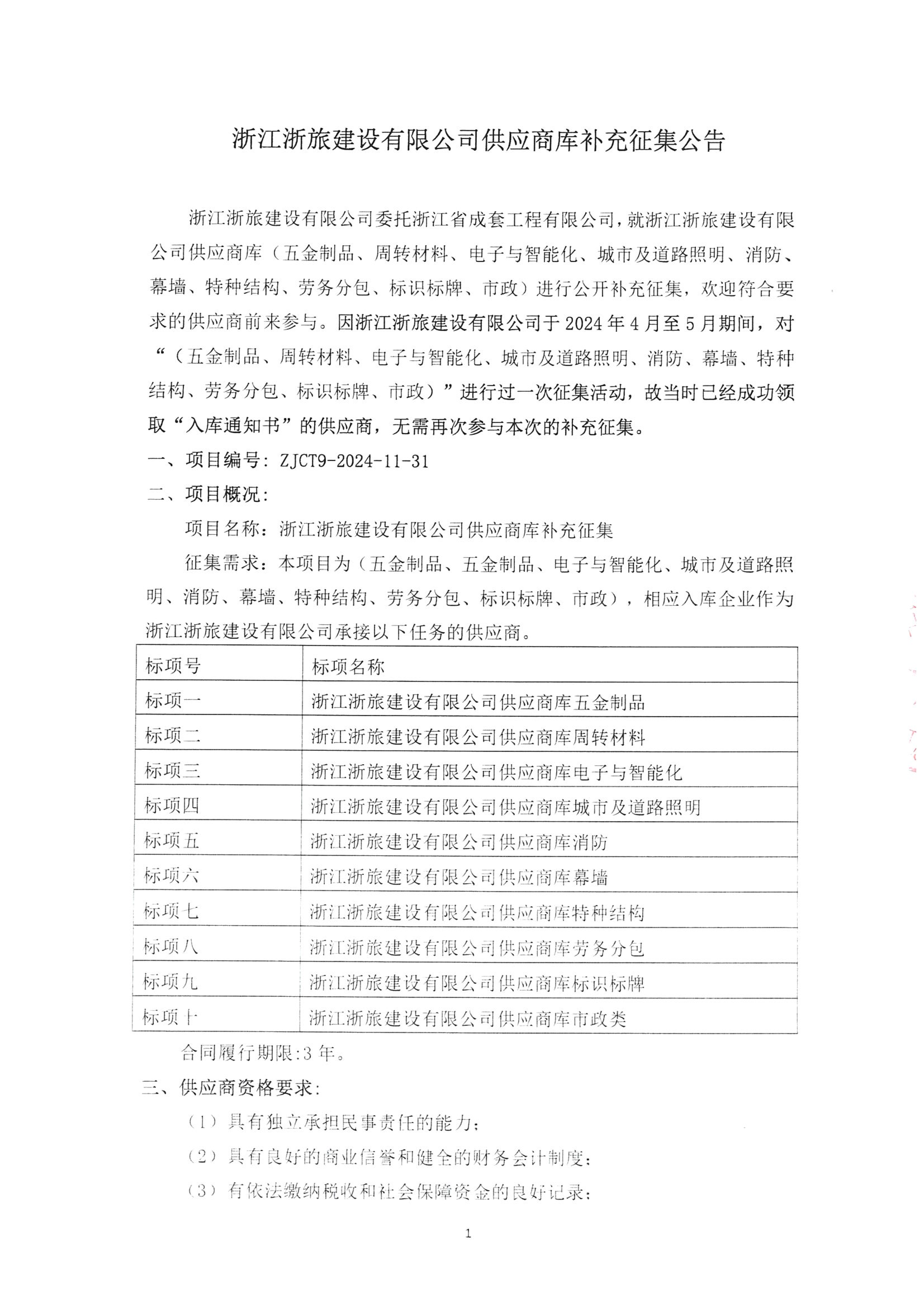 浙江浙旅建設(shè)有限公司供應(yīng)商庫(kù)補(bǔ)充征集